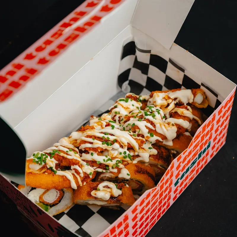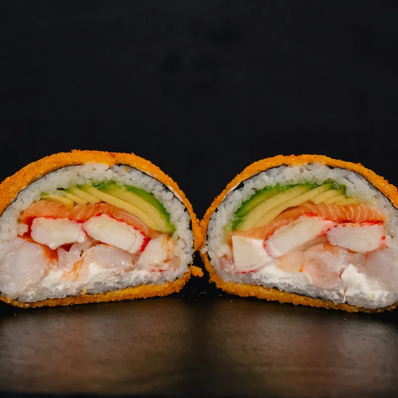 Queso crema, palta, camarón apanado con topping de camarón crocante en salsa fuji, envuelto en sésamo.